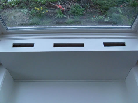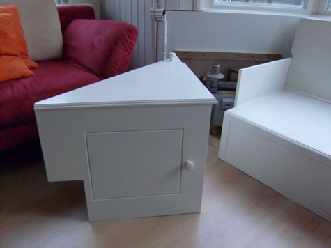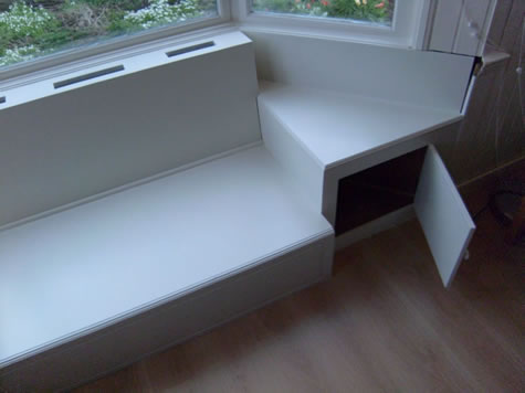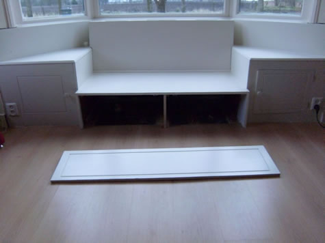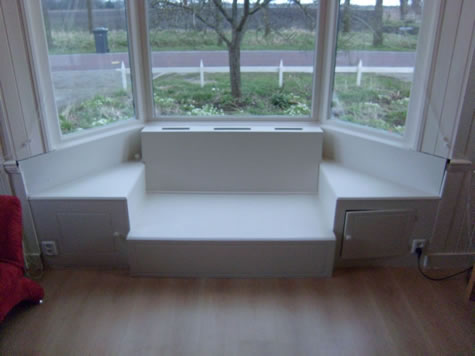 De bank is in de erker ingebouwd, een echte "vensterbank". De bank is gemaakt van multiplex en is wit gelakt.
