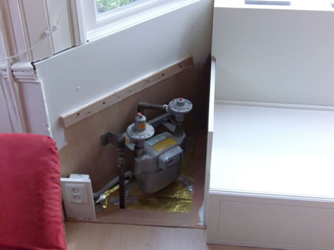 Aan de linkerkant is het kastje weg te nemen zodat de gasmeter bereikbaar is. Onder de bank is een bergruimte door de klep te openen.