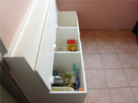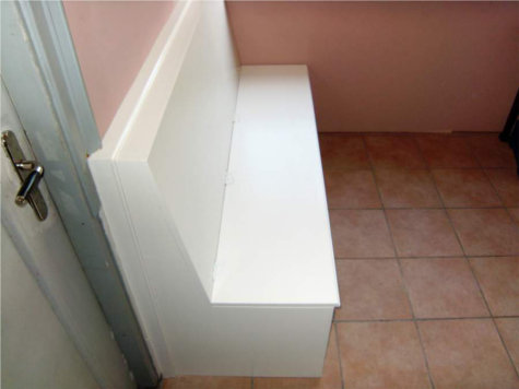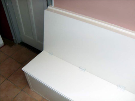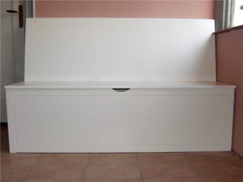 Deze bank is gemaakt van hardhout multiplex en afgewerkt met witte zijdeglanslak. Het zitvlak kan worden opengeklapt zodat er bergruimte ontstaat.