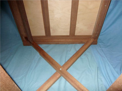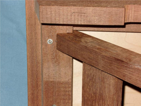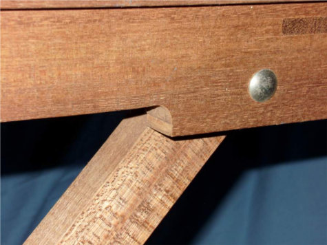 Het tafelblad is gemaakt van multiplex en de randen van het blad zijn verlijmd met meranti-hout, de poten zijn ook van meranti gemaakt.
