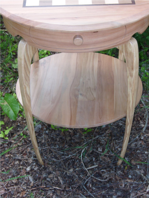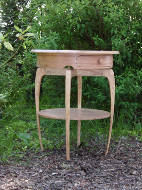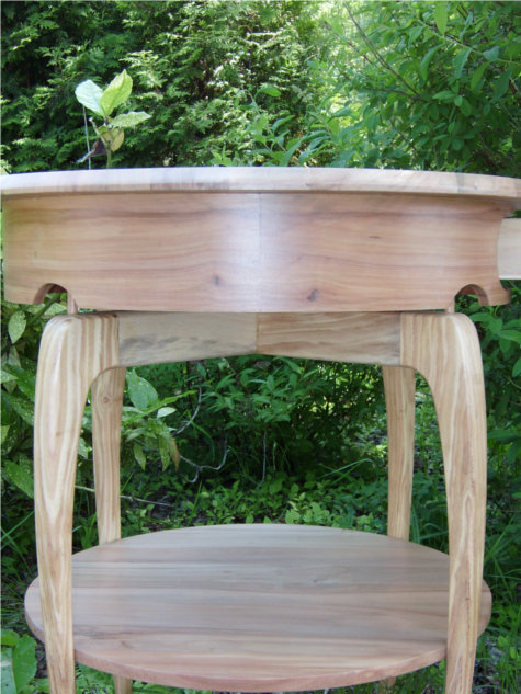 Het bovenblad, het onderblad en het ladegedeelte is gemaakt van appelhout. De poten zijn gemaakt van christendoornhout.