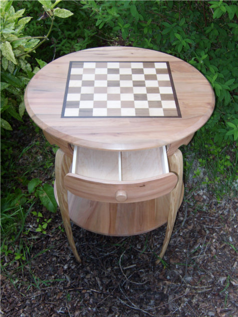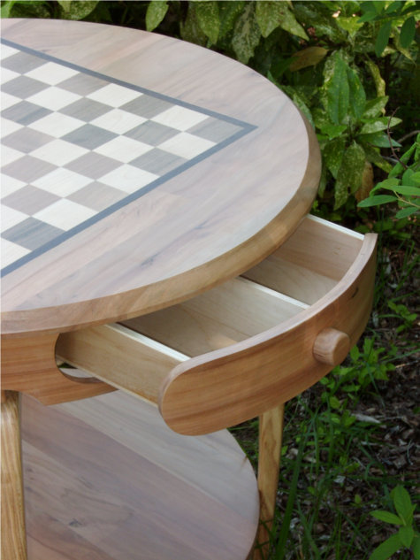 Het schaakbord is inlegwerk, de donkere vlakken zijn van notenhout en de lichtere vlakken van esdoornhout.