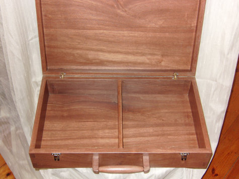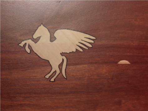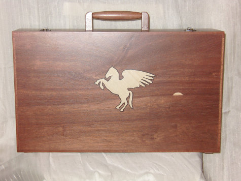 Pegasus en de zon zijn beide inlegwerk en zijn gemaakt van christendoornhout. De koffer is gemaakt van hardhout meranti. Het deksel is bevestigd met inbouwscharnieren van messing en de sloten zijn knipsloten. De scheepskoffer is afgewerkt met meubellak.